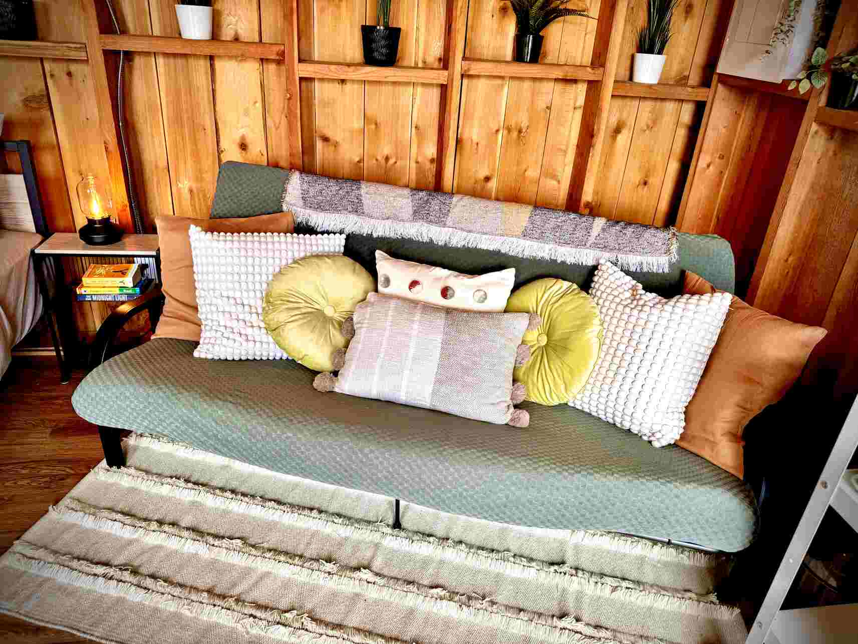 Your lakefront cabin includes a comfortable queen-size bed. For a cozy reading nook or additional guests, the futon couch easily transforms into a second bed (linens provided).